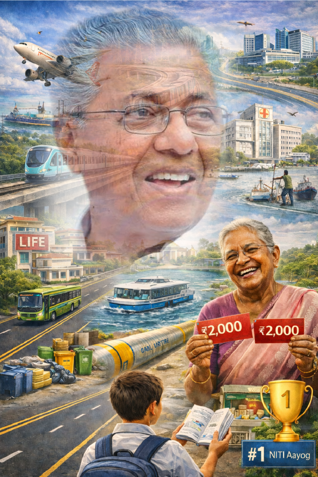👉 കണ്ണൂർ വിമാനത്താവളവും, വിഴിഞ്ഞം തുറമുഖവും പൂർത്തിയാക്കി. വിമാന–കപ്പൽ സർവീസുകൾ തടസ്സമില്ലാതെ നടക്കുന്ന കാലം.